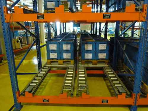 在貨架的組與組之間沒有作業通道,從而增加了60%的空間利用率,提高了倉儲的容積率;托盤操作遵循先進先出的原則;自動儲存回轉;儲存和揀選兩個動作的分開大大提高輸出量,由于是自重力使貨物滑動,而且沒有操作通道,所以減少了運輸路線和叉車的數量。