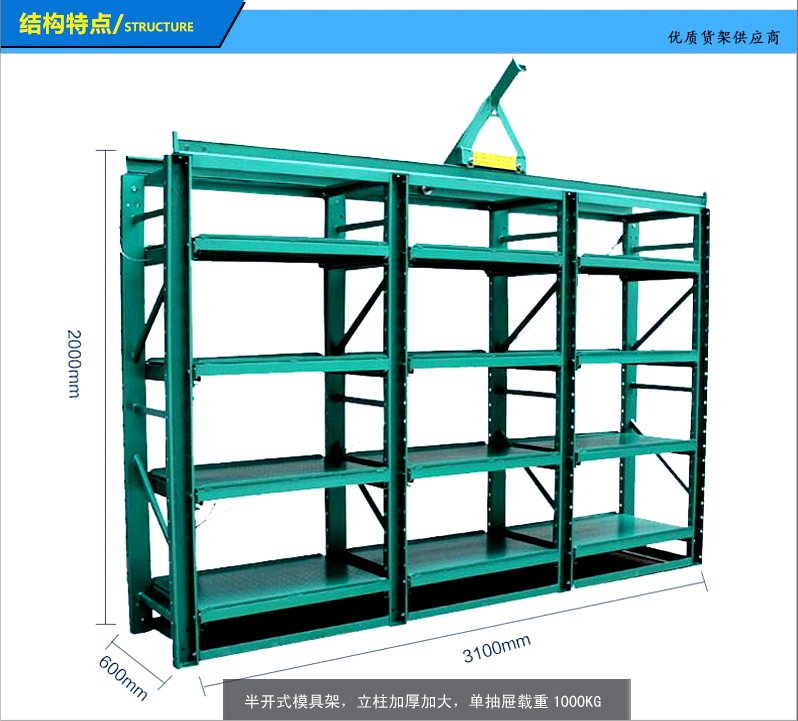 模具貨架適合于存放模具等機(jī)械加工塊的存放。占地少、承重大、分類詳細(xì)、存取方便。抽屜式滑道,可以80%抽出,操作簡(jiǎn)易,安全,是現(xiàn)代化工廠的維修及加工車間的工位器具。